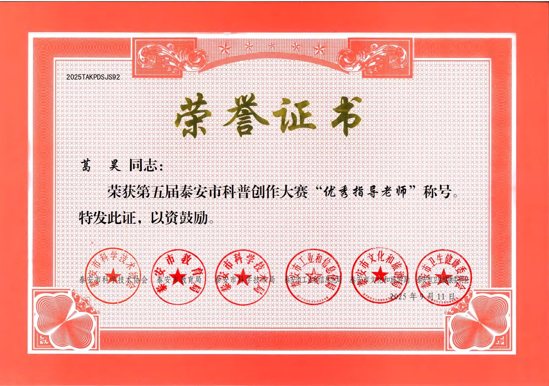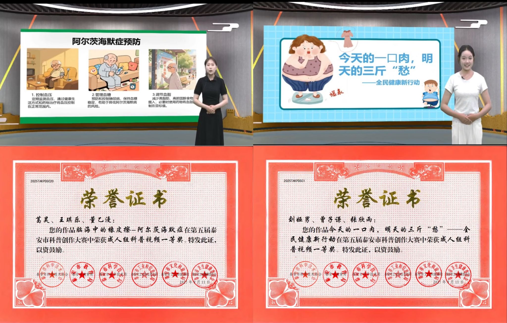 在第五届泰安市科普创作大赛中,作品《脑海中的橡皮擦—阿尔茨海默症》《今天的一口肉,明天的三斤“愁”——全民健康新行动》,双双斩获科普视频创作一等奖。教师葛昊获评“优秀指导老师”荣誉称号。