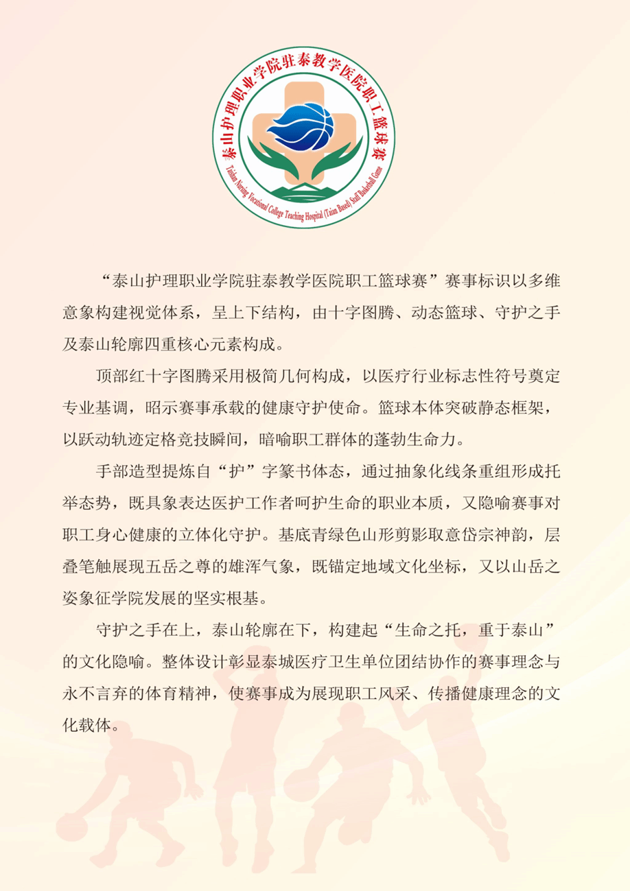 5月19日开幕式上,泰安市中心医院党委副书记、院长王兴玲致辞强调,赛事是落实全民健身战略、深化医教协同的创新实践,旨在通过文体交流强化院校与医院的纽带,建立常态化联络机制。学院党委书记杨建全宣布开幕,并与泰安市中医医院院长孟光源共同为赛事标志揭牌。本届标志融合红十字图腾、动态篮球、守护之手及泰山轮廓,象征“生命之托,重于泰山”的使命与团结拼搏的体育精神。
