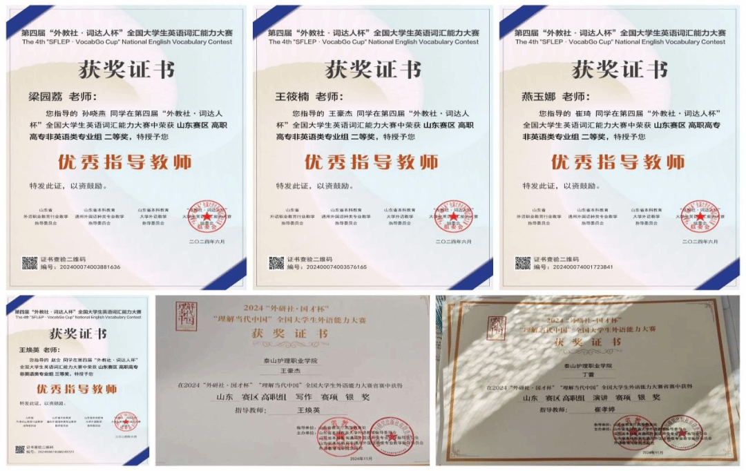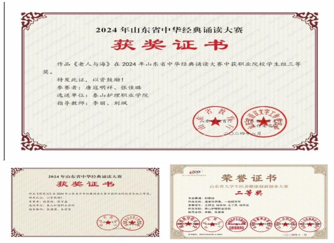 人文赛事屡获佳绩。荣获山东省中华经典诵读大赛三等奖2项,山东省大学生医养健康创新创业大赛二等奖1项。参加2024年山东省大学生运动会健美操(啦啦操)项目获得单项第四名与第六名的成绩;篮球项目女子乙组获得第八名的成绩。获得2024年“外教社•词达人杯”全国大学生英语词汇能力大赛山东分赛二等奖6项,三等奖10项,共计16项,同时荣获优秀组织奖。王焕英老师指导学生获山东省国才杯英语写作大赛银奖、崔孝婷老师指导学生获演讲大赛银奖。在泰安高校大学生“强国有我•青春向党”艺术展演活动中,学院舞蹈《红色记忆》荣获二等奖。