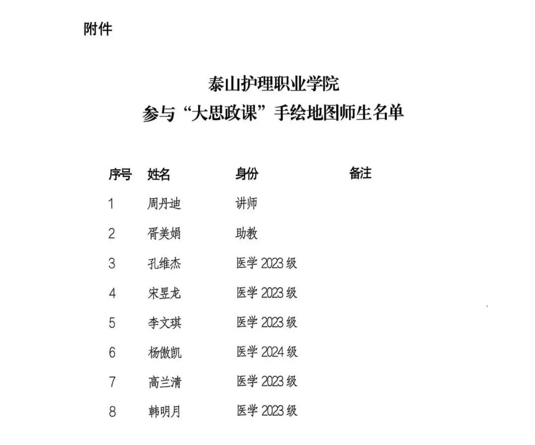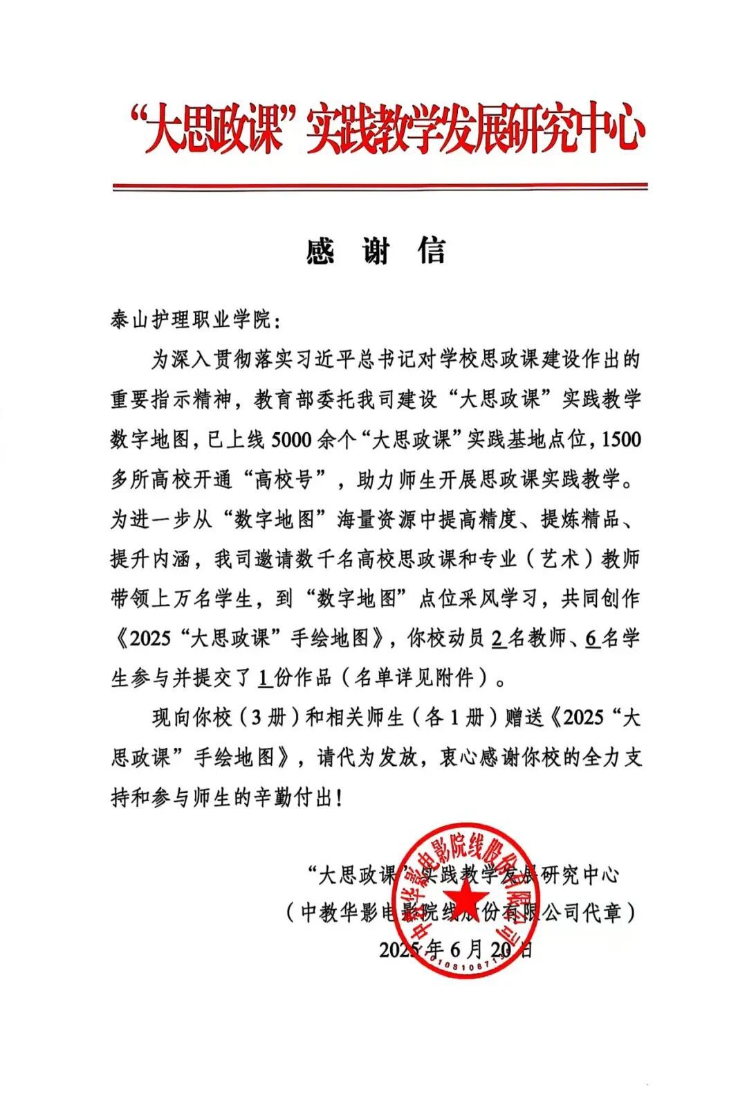 为深入贯彻落实习近平总书记关于学校思政课建设的重要指示精神,持续推进党的创新理论“三进”工作,泰山护理职业学院组织师生参与教育部“‘大思政课’实践教学手绘地图”项目,并获主办方致信感谢。