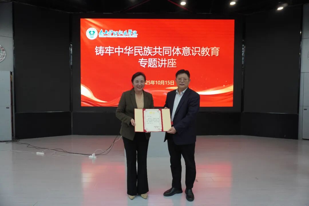 报告结束后,张建国代表学院向法文静颁发了“泰山护理职业学院民族团结教育校外指导教师”聘书。