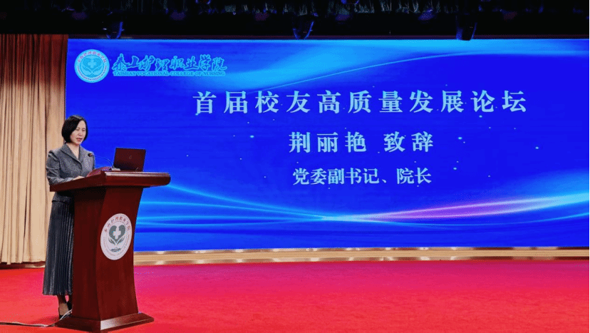 论坛伊始,全体参会人员共同观看学院宣传片,直观感受学校六十九年来的发展变迁。荆丽艳在致辞中回顾了学院的发展历程,从单一校区的卫生学校,成长为拥有两个院区、占地530余亩的现代化高职院校,现有全日制在校生1.1万余人、教职工630余人,重点建设护理、康复等“六大专业群”,19个招生专业中多个专业群入选省级高水平专业群。她强调,学院的成就离不开校友的支持,校友是学校精神的传承者、品牌声誉的“行走名片”,此次论坛搭建了校友与母校互动的桥梁,为学院注入新动能。