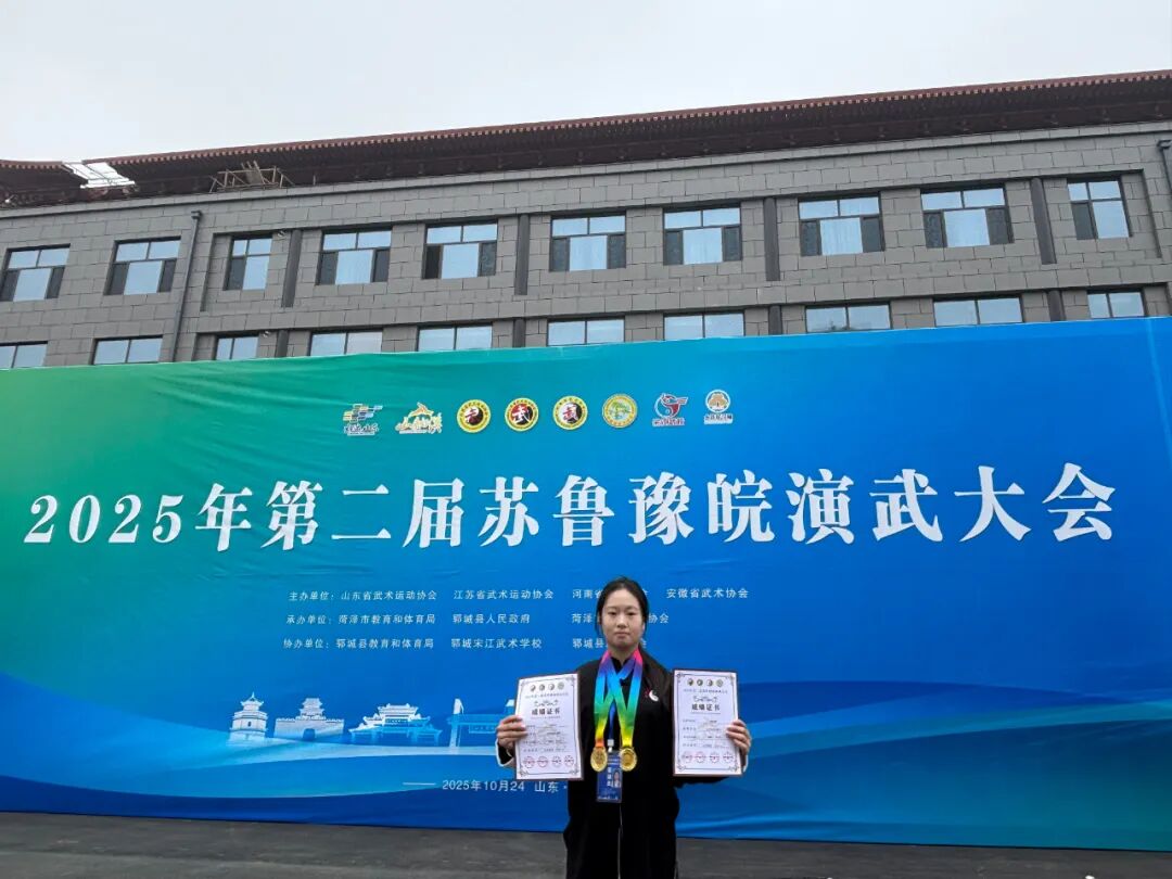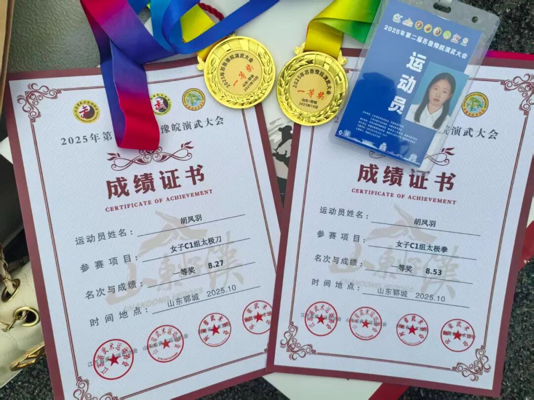 10月25日,第二届苏鲁豫皖演武大会在宋江武校开幕,泰山护理职业学院2024级护理专本贯通班学生胡凤羽在陈式太极拳、陈式太极单刀两个项目再夺一等奖,载誉而归。