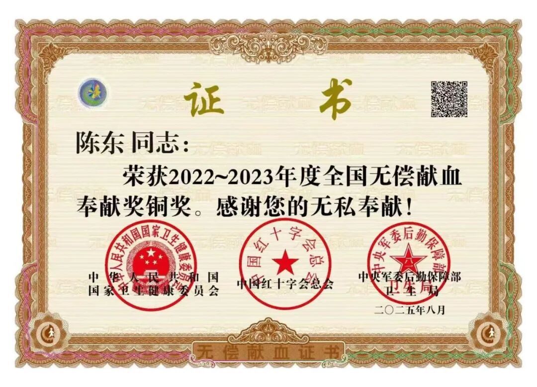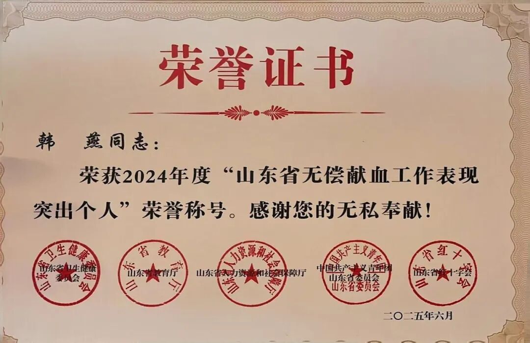 一幕幕生命接力的感人故事在不断上演。教师韩燕已经坚持无偿献血23年,累计献血量达到7400毫升,不仅是全国无偿献血奉献奖获得者,还被表彰为“2024年度山东省无偿献血工作表现突出个人”。教师陈东献血26年,既是学院献血活动的积极组织者,也是全国无偿献血奉献奖铜奖获得者。他们的感人事迹,为学子们树立了光辉的榜样。