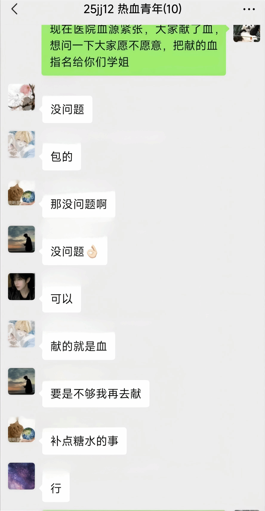 消息一出,回应如潮。12名同学积极响应,微信群瞬间被坚定而温暖的回复刷屏。有同学主动提出“要是不够我再去献”,还有同学说“补点糖水的事”,轻松的话语背后是无私奉献的精神。