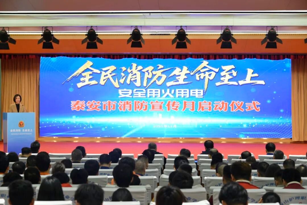 本月是山东省第15个法定消防宣传月,11月7日上午,泰安市2025年消防宣传月启动仪式在泰山护理职业学院举行,主题为“全民消防、生命至上、安全用火用电”。市政府安全生产委员会成员单位相关负责同志、消防指战员代表、相关行业(电力、燃气、外卖、快递)代表、学院领导及师生代表共计500余人参加了启动仪式。