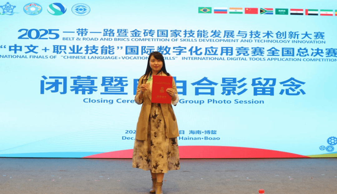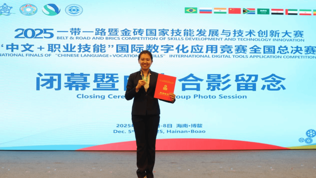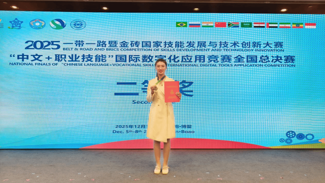 12月5日至8日,2025一带一路暨金砖国家技能发展与技术创新大赛首届“中文+职业技能”国际数字化应用竞赛全国总决赛,在海南博鳌亚洲论坛国际会议中心顺利举办。本次大赛汇聚了全国近600位参赛选手,其中教师组选手近160人,选手们相互学习,彼此启迪,在激烈的角逐中展开最终对决。学院选派3名教师在高水平竞技中表现卓越,斩获多项荣誉。医学技术系教师丁恩光、伊丹凭借出色表现获得二等奖,药学系教师朱欣培获三等奖,学院获评优秀组织奖。