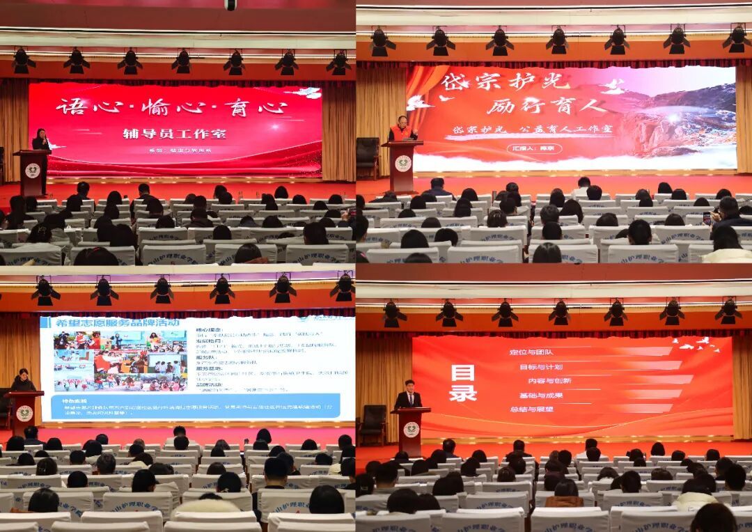 汇报评比环节,学工处及各系部教师代表依次进行汇报,系统介绍了各辅导员工作室的建设理念、实践成果及育人特色,展现了各工作室在专业化、品牌化发展方面的探索与成效。