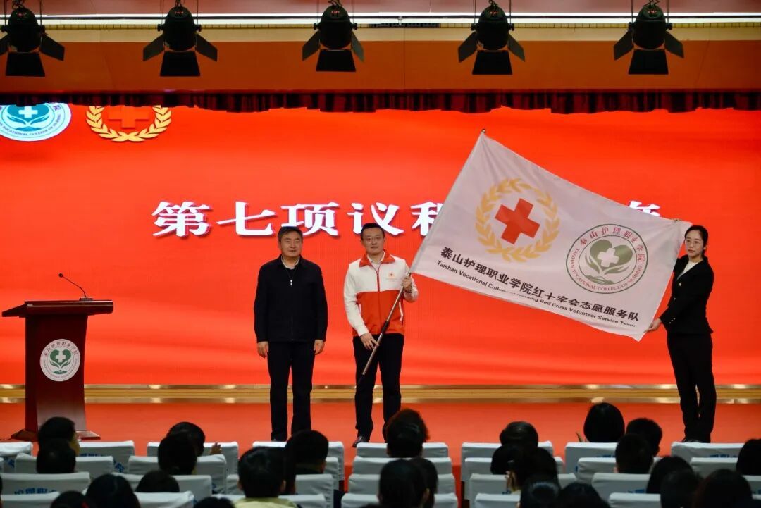 市红十字会与学院共同为“泰山护理职业学院红十字会”揭牌,并为红十字会志愿者服务队授旗。