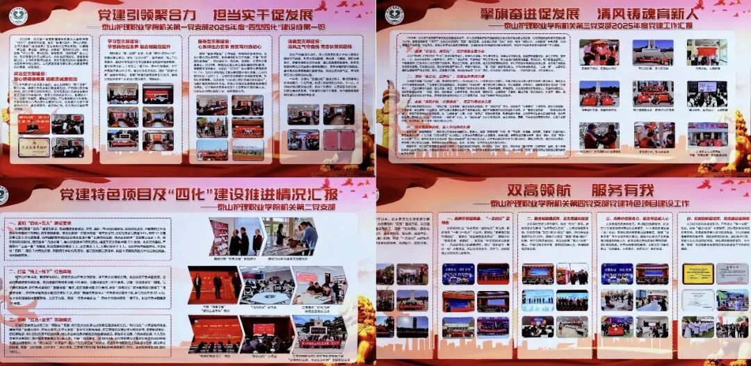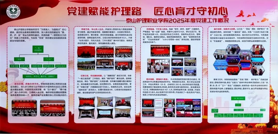 在学院党建概况展区,组织人事处围绕职业教育发展新定位,紧扣“为党育人、为国育才”根本任务,全面介绍了学院推动党建工作与“医、药、护、技”专业元素深度融合的实践路径,着力构筑“一核双轮三力四化”的泰护特色党建新格局,持续擦亮“‘双高’领航·泰护敢当”党建品牌。