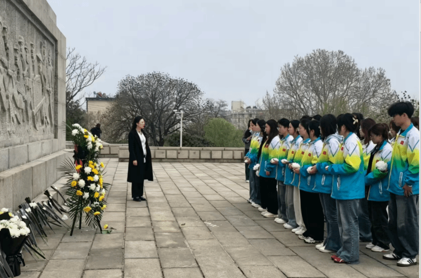 乘车途中,思政教师王玥缓缓讲述着陵园内革命烈士的事迹,将镌刻在泰汶大地上的红色记忆送到学子心中,为这场沉浸式思政教育做好铺垫。步入陵园,师生们整齐列队,缓步走向烈士纪念碑,敬献花篮、整理挽联,动作虔诚庄重;肃立默哀、低头追思,随后将亲手制作的白花敬献于碑前,寄托对英烈的无限哀思。