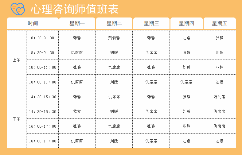 心理中心咨询排班表更新啦!