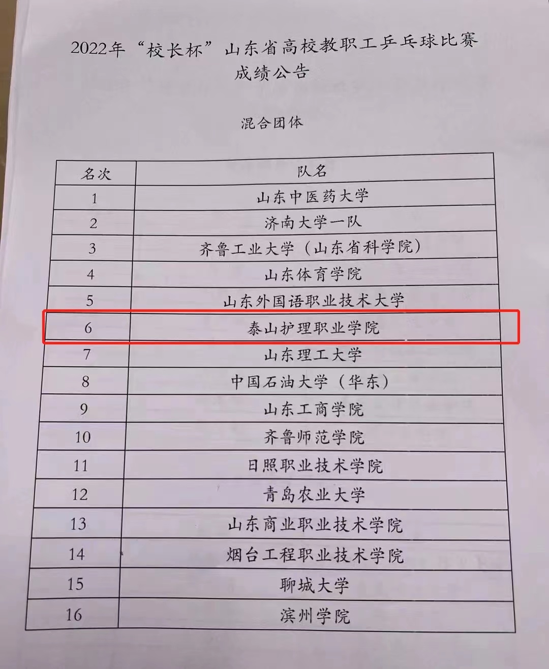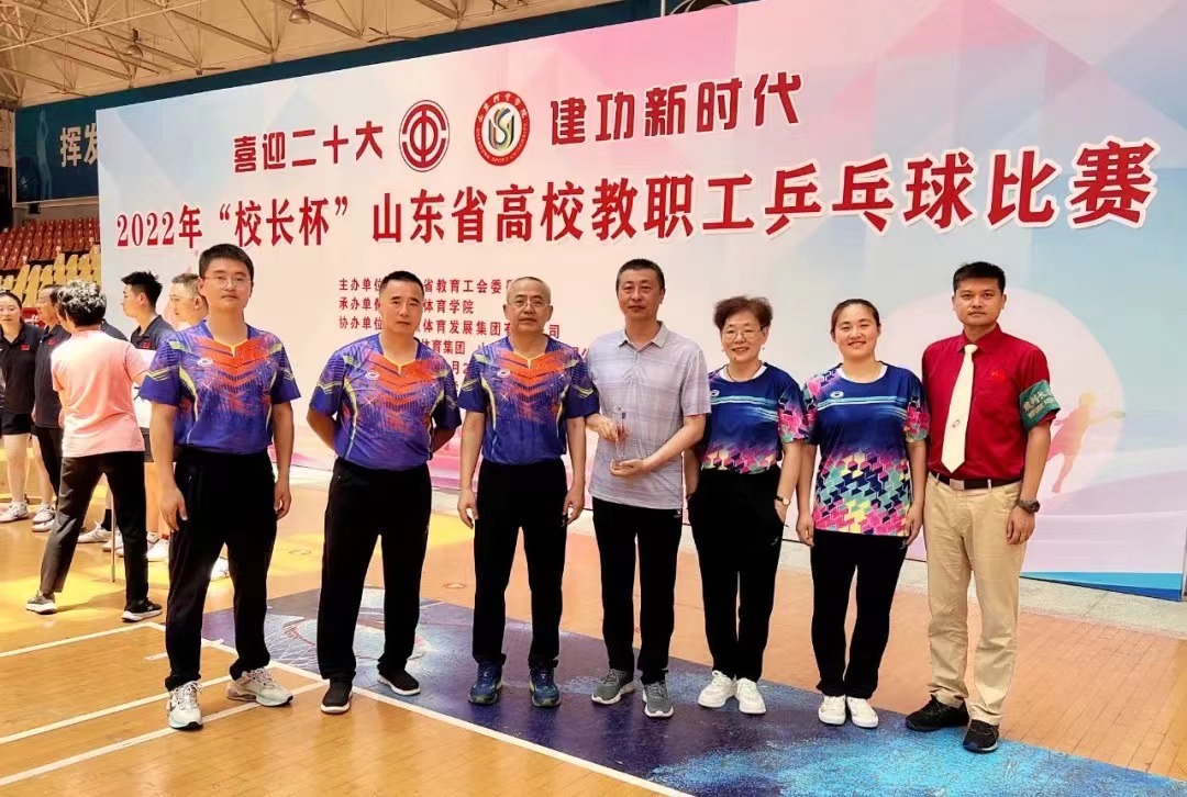 6月21日,由山东省教育工会委员会主办、山东体育学院承办的“喜迎二十大 建功新时代”2022 年“校长杯”山东省高校教职工乒乓球比赛在山东体育学院日照校区国家篮球学院训练馆隆重开幕。学院代表队奋力拼搏,过关斩将,最终取得了团体比赛第六名的优异成绩。