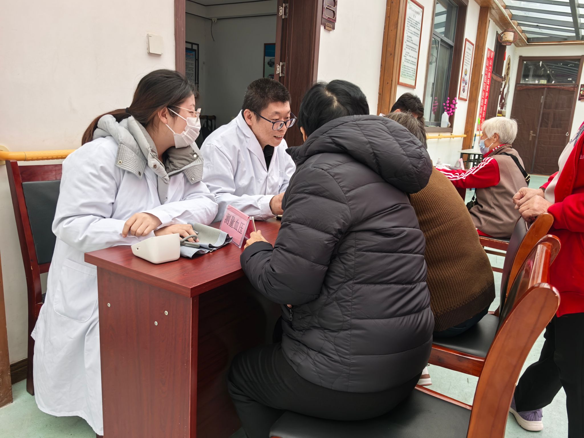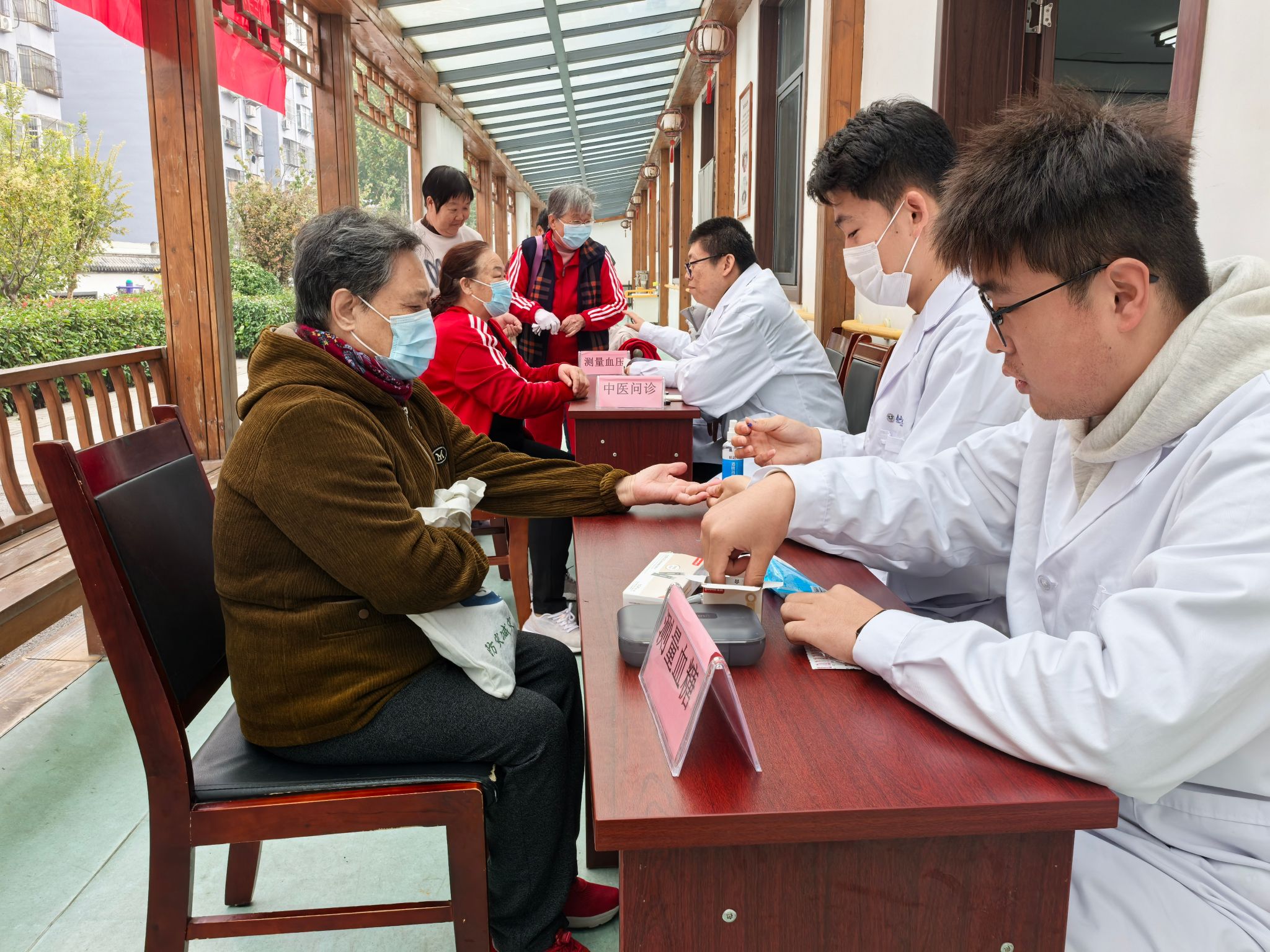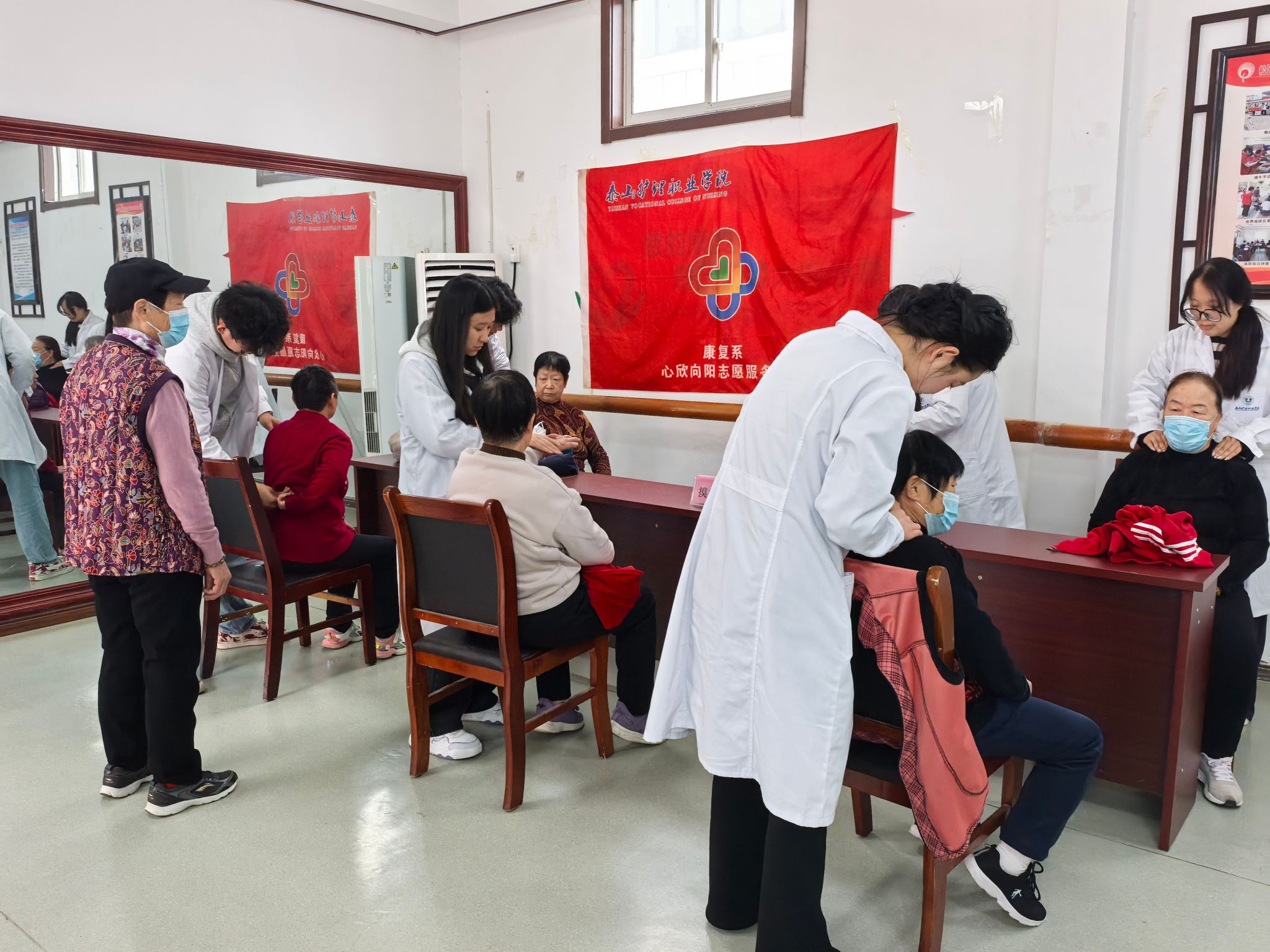 活动中,同学们发挥专业特长,设健康监测、中医咨询、推拿按摩等区域,传递关怀、弘扬尊老风尚。健康监测区,志愿者耐心测血糖血压、记录数据,给异常者温馨提示;中医咨询区,马鹏飞望闻问切把脉,解答养生及慢性病疑问、传授保健知识;推拿按摩区,志愿者专业手法放松老人肩颈、舒缓筋骨,获阵阵赞叹。此次实践,同学们锤炼了技能、增强了责任感,实现实践育人与服务社会融合,现场气氛温馨。