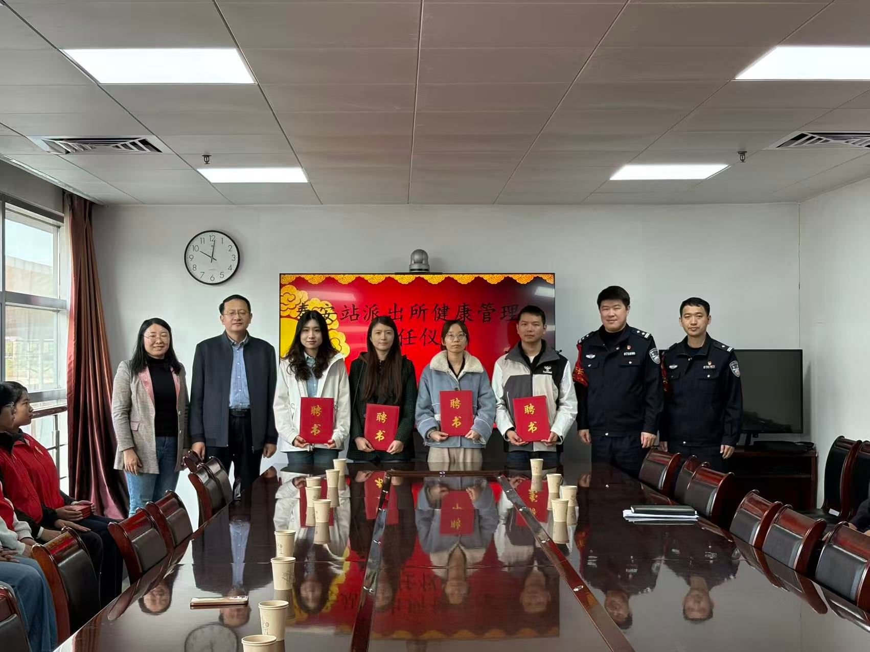 活动伊始,警校共建座谈暨互聘仪式顺利举行。双方代表围绕党建共建深化、健康服务常态化、安全教育合作等核心议题展开深入交流,明确了长期共建的方向。仪式上,党委委员、健康与管理系主任党帅为4名民警颁发“法治辅导员”聘书,聘请其为学生开展防诈骗、防欺凌等法治宣讲;泰安站派出所所长李峰为4名教师颁发“健康管理师”聘书,邀请其为民警提供专业健康知识宣讲与服务。一纸聘书既是信任也是责任,为后续警校全方位合作筑牢根基。