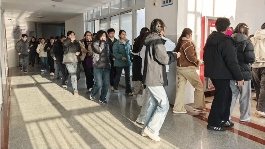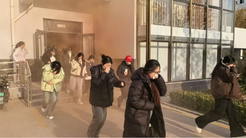 当日15:30,校园内突然响起尖锐的消防警报,打破了往日的宁静。警报声即为命令,正在教学楼学习、宿舍休息的学生迅速响应,按照演练预案,立即取出纸巾用水打湿,规范捂住口鼻,弯腰低姿沿安全通道快速撤离。楼道内秩序井然,无拥挤喧哗现象,身着红马甲的安全员在各楼层楼梯口定点值守,挥舞指示牌引导方向,及时纠正个别学生直立行走等不规范动作,对因紧张走错路线的大一新生进行耐心疏导,确保撤离队伍高效有序推进。当最后一名学生安全抵达操场指定集合区域后,各系负责人迅速开展人数清点工作,确认全员安全撤离。