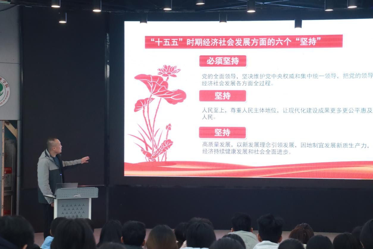 学工处(团委)处长王征对《中国共产党第二十届中央委员会第四次全体会议公报》进行解读,说明“十五五”时期经济社会发展的指导思想、主要目标,并结合学生实际,重点讲解“加快高水平科技自立自强,引领发展新质生产力”“建设现代化产业体系”“一体推进教育科技人才发展”等与青年成长紧密相关的部署要求,帮助学生理解全会精神实质,鼓励他们将个人发展融入国家大局。