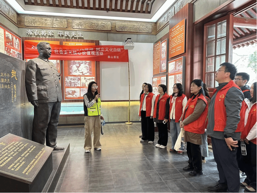 活动伊始,全体党员干部在革命烈士祠前庄严肃立,向革命先烈默哀致敬,表达深切缅怀与崇高敬意。在讲解员的带领下,大家参观了冯玉祥泰山主题陈列馆。馆内珍贵的历史图片、革命文物和文献资料,生动再现了冯玉祥将军在泰山期间留下的感人故事以及他爱国为民、追求进步的光辉一生。党员干部们认真聆听,不时驻足交流,深切感悟革命先辈的崇高精神与坚定信念。