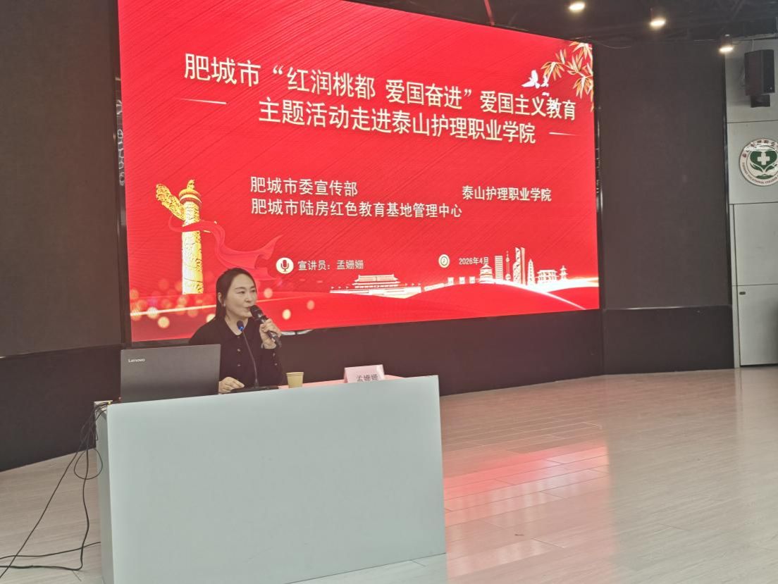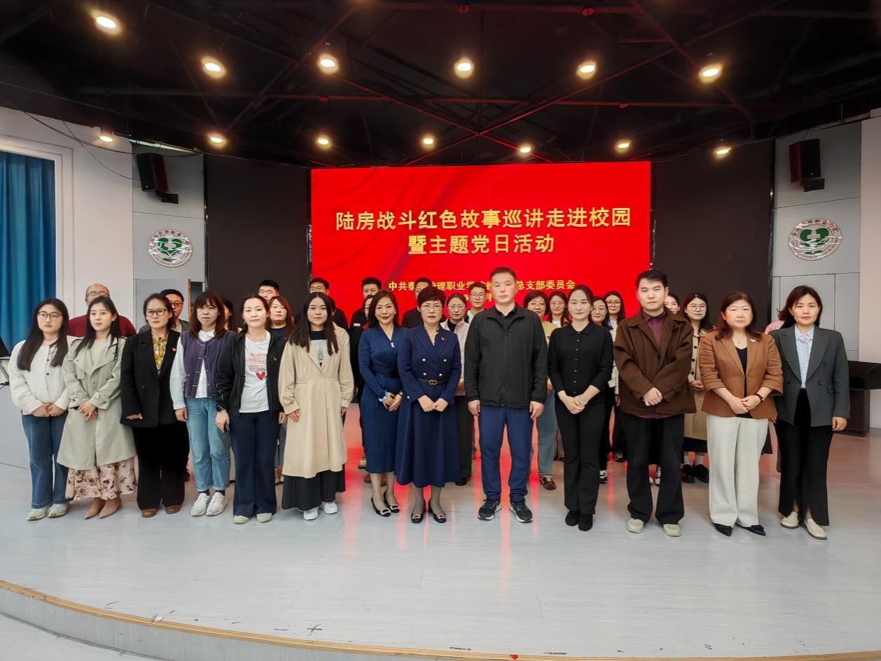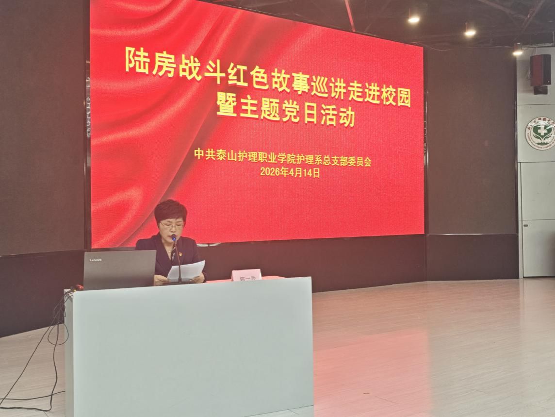 4月14日,泰山护理职业学院护理系党总支举办“陆房战斗红色故事巡讲走进校园暨主题党日活动”,活动由党总支书记郭一兵主持,护理系全体党员教师及学生代表共 300余人参加。