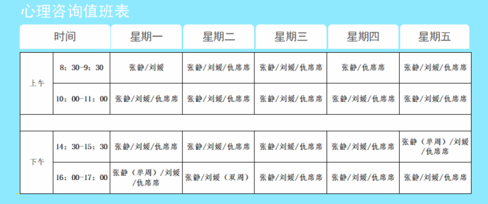 (小提示:由于课程有单双周的安排,所以咨询师的某个预约时间段会有单双周的不同,敬请谅解!)