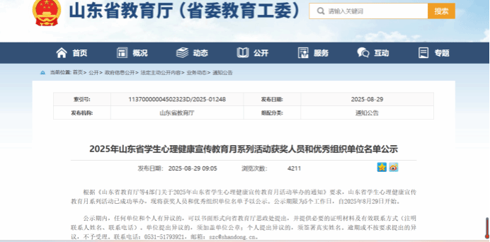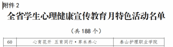 近日,山东省教育厅发布了《2025年山东省学生心理健康宣传教育月系列活动获奖人员和优秀组织单位名单公示》,我院“心育花开 五育同行·草本养心”系列活动获评山东省学生心理健康宣传教育月特色活动,相关成果获专家组高度认可,体现了学院在心理健康教育工作的扎实推进。