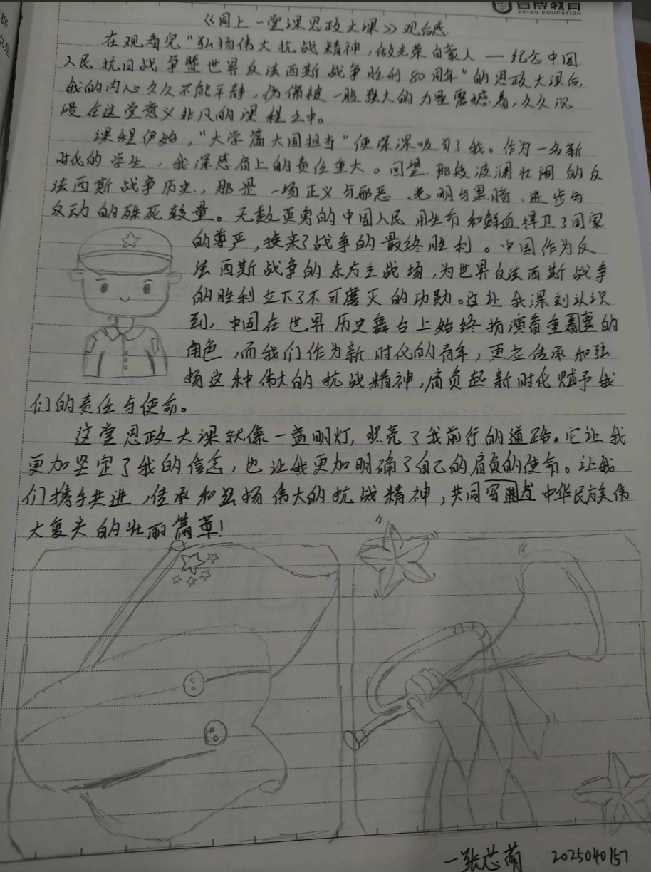 9月18日,思政部组织开展“铭记历史·警钟长鸣·振兴中华”主题教育活动。活动中,任课教师与授课班级同学一起观看九一八事变历史纪录片,重温那段屈辱与抗争的岁月;学习相关法律法规中关于爱国主义教育、国防教育的条款,强调铭记历史对法治建设的重要意义;统一收看同上一堂思政课《弘扬伟大抗战精神,做光荣自豪中国人》,学生门结合自身的学业和专业实际,认真撰写观后感。通过此次活动,进一步激发了师生的爱国情怀和责任担当,为今后的教师教学和学生成长注入了精神动力。