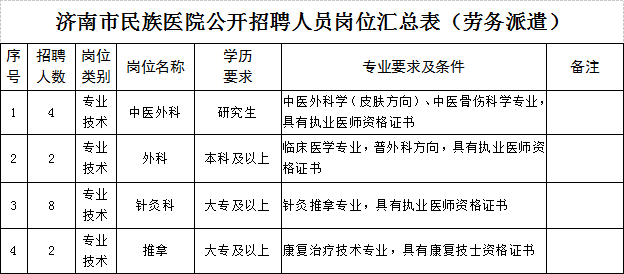 济南宏达人力资源服务有限公司根据济南市民族医院需要,公开招聘医疗岗位劳务派遣工作人员。现将有关事项公告如下: 一、单位简介