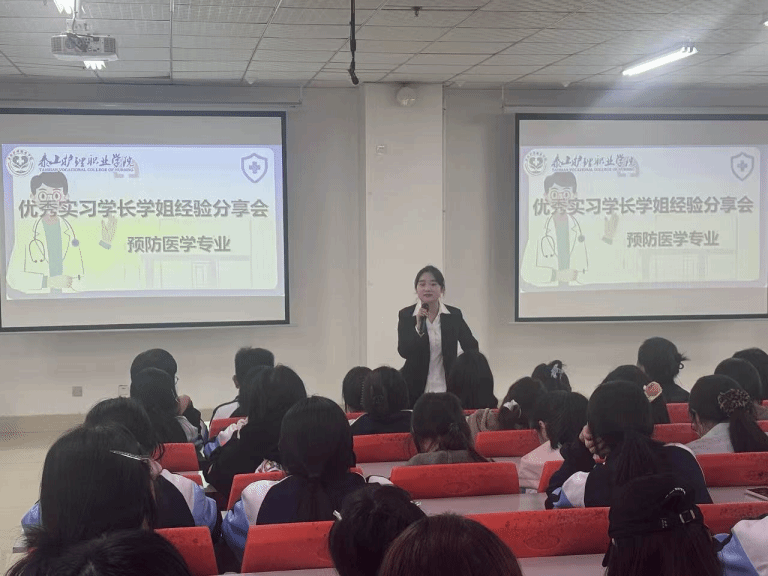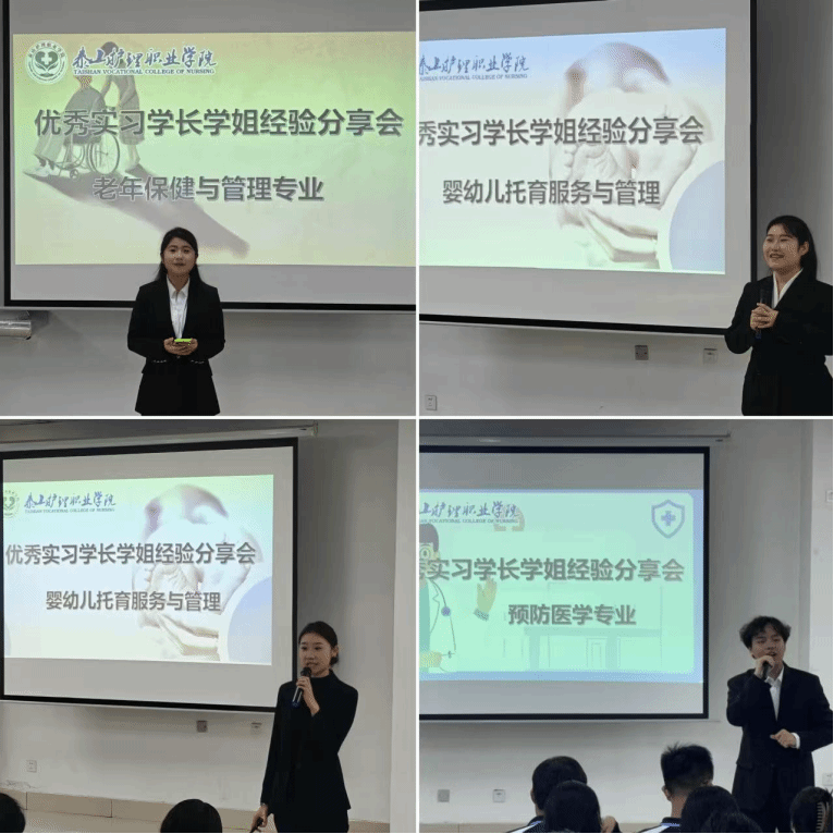 健康管理专业的吴敏娜抛出“三主动”黄金法则:“主动向老师请教、主动参与实操、主动钻研问题”,用亲身经历证明“唯有主动出击,才能在实习中收获真知识、练就硬本领”,其对工作的热忱与责任心引发全场深度共鸣。老年保健与管理专业的夏雪,聚焦老年照护实操技巧、医患沟通艺术等核心内容,分享了在养老机构实习中“用专业守护夕阳红”的暖心故事与实用经验。预防医学韩冰表示在公共卫生医疗中心实习期间,深刻体会到“责任”二字重于泰山,预防医学的责任不仅是守护个体健康,更是筑牢群体安全的防线。婴幼儿托育服务与管理专业的张化男,围绕托育机构日常照护、早期教育引导等内容,分享了“用爱心呵护成长、用专业守护童真”的实习感悟,为意向从事托育行业的同学提供了鲜活参考。