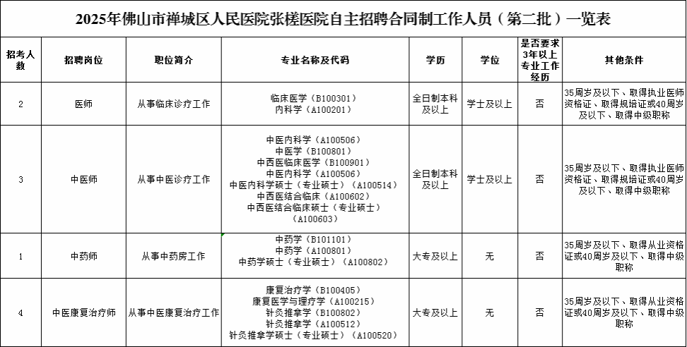 具体岗位任职条件详见《2025年佛山市禅城区人民医院张槎医院自主招聘合同制工作人员(第二批)一览表》,年龄计算截止时间为报名开始当天。
