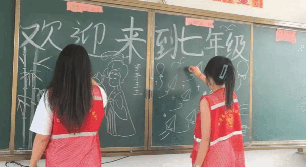 转身走进镇中学,志愿者们又化身为“美育引路人”,用画笔传递温度。教室里,创意如星火蔓延,健康知识、传统文化、青春奋斗,欢迎新生等主题在笔尖生长,色彩在板面晕染。同学们从最初的懵懂,到后来自如勾勒线条、搭配色彩,一幅幅黑板报,是创意的绽放,更是校地携手、青春互动的见证。