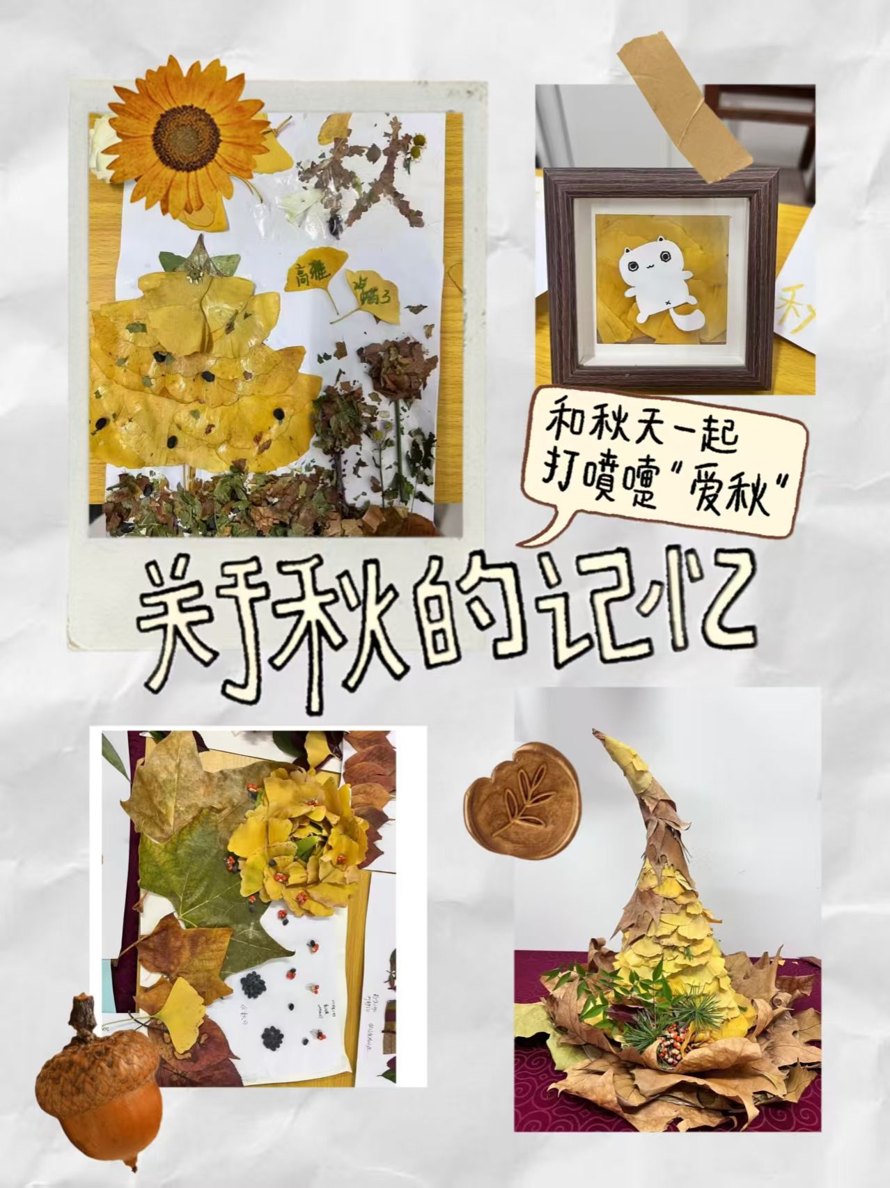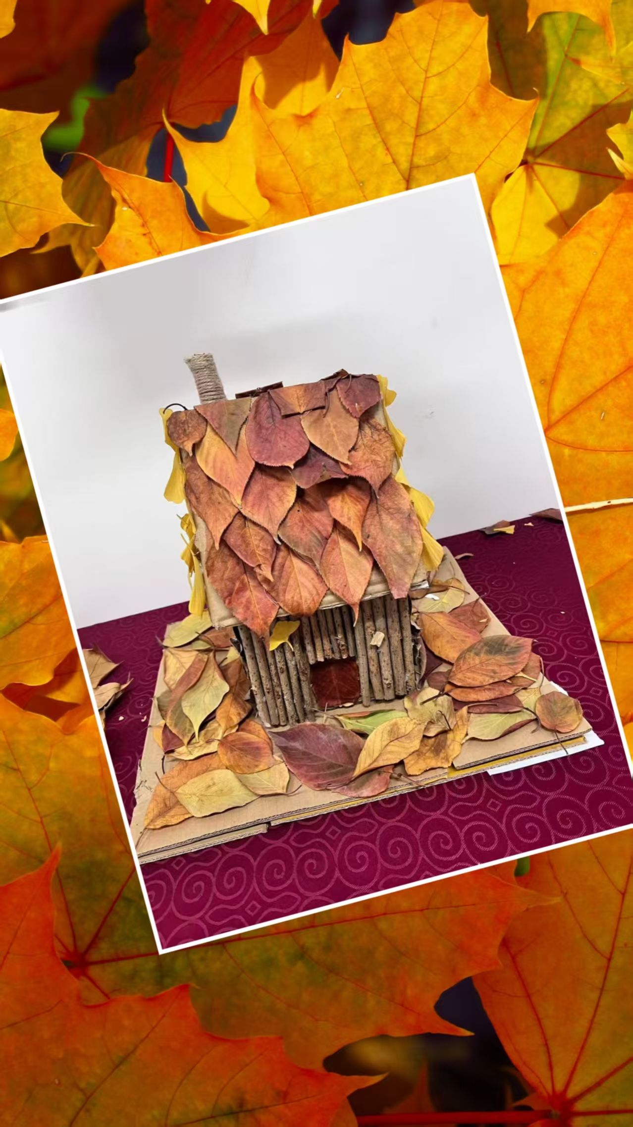 我们把深浅不一的叶剪成瓦片的形状,一层层叠在纸壳框架上,居然搭出了座暖融融的“秋叶小屋”。