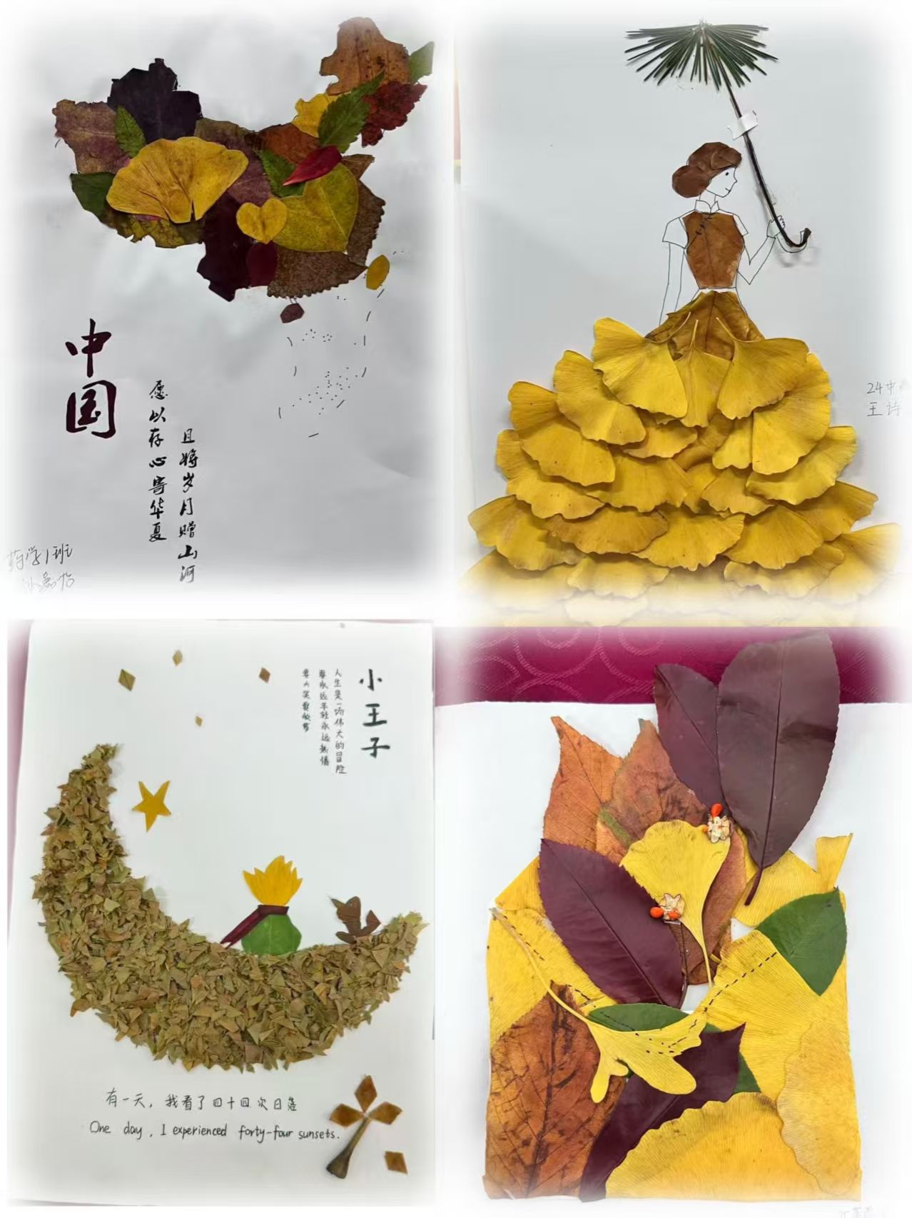 这句话被我们用碎叶拼成了弯月亮:浅褐色的叶屑铺成月光的褶皱,嫩黄的叶剪作小王子的金发,连那朵娇气的玫瑰,都是用银杏叶卷出来的。