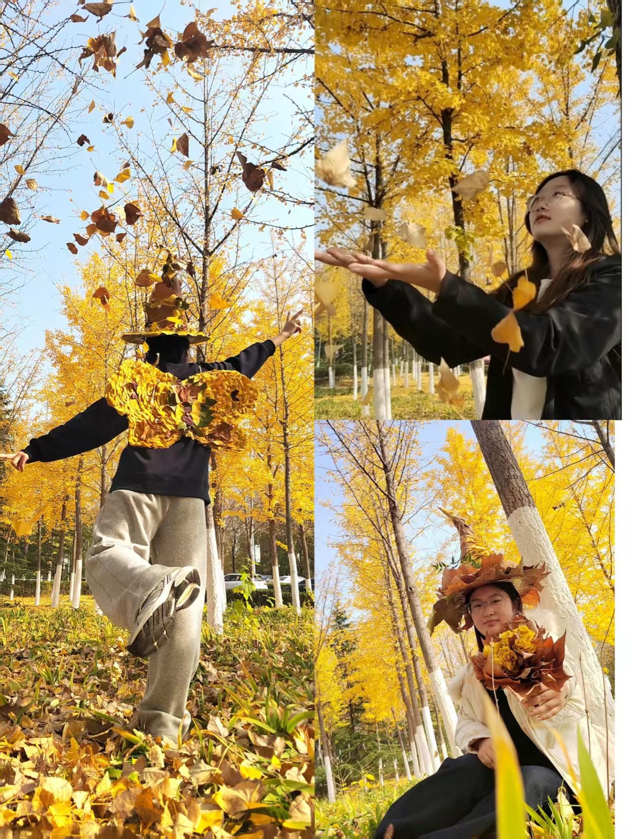 有人用叶粘了顶尖帽,戴上的瞬间,好像变成了藏在秋林里的精灵,跳起来时,帽尖的银杏还会跟着落;