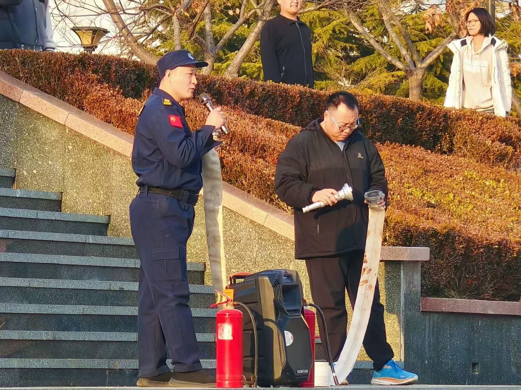 全体师生安全抵达集结区域后,各班迅速清点人数并逐级上报,整个过程信息畅通、响应及时。随后,学校保卫处专业人员为师生进行了消防安全知识讲解,重点演示了灭火器和消防水带的正确使用方法,详细分解了灭火器“提、拔、握、压”的操作要领,并指导师生代表现场实操,确保掌握灭火技能。