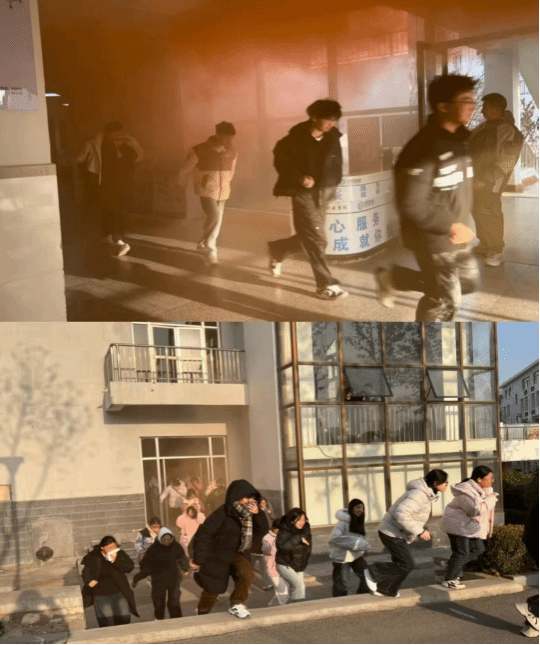 随着消防警报响起,演练正式启动。本次演练针对不同场景设置了差异化方案:24级全体学生在老师引导下,用湿毛巾捂住口鼻,沿预定路线从教学楼快速疏散至中心广场指定区域;25级学生则模拟宿舍楼起火场景,在模拟烟雾中沿安全标识有序撤离至集结地点。
